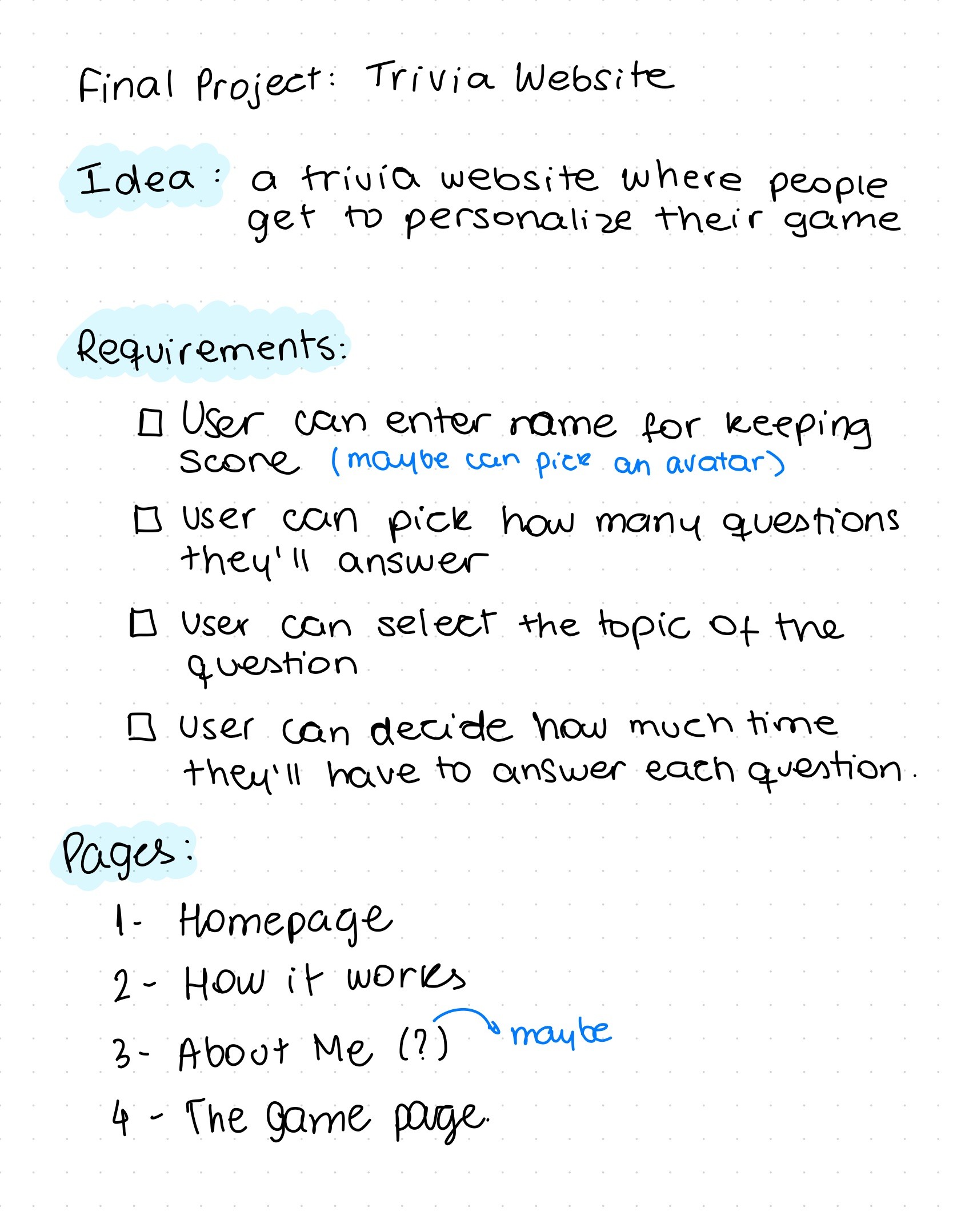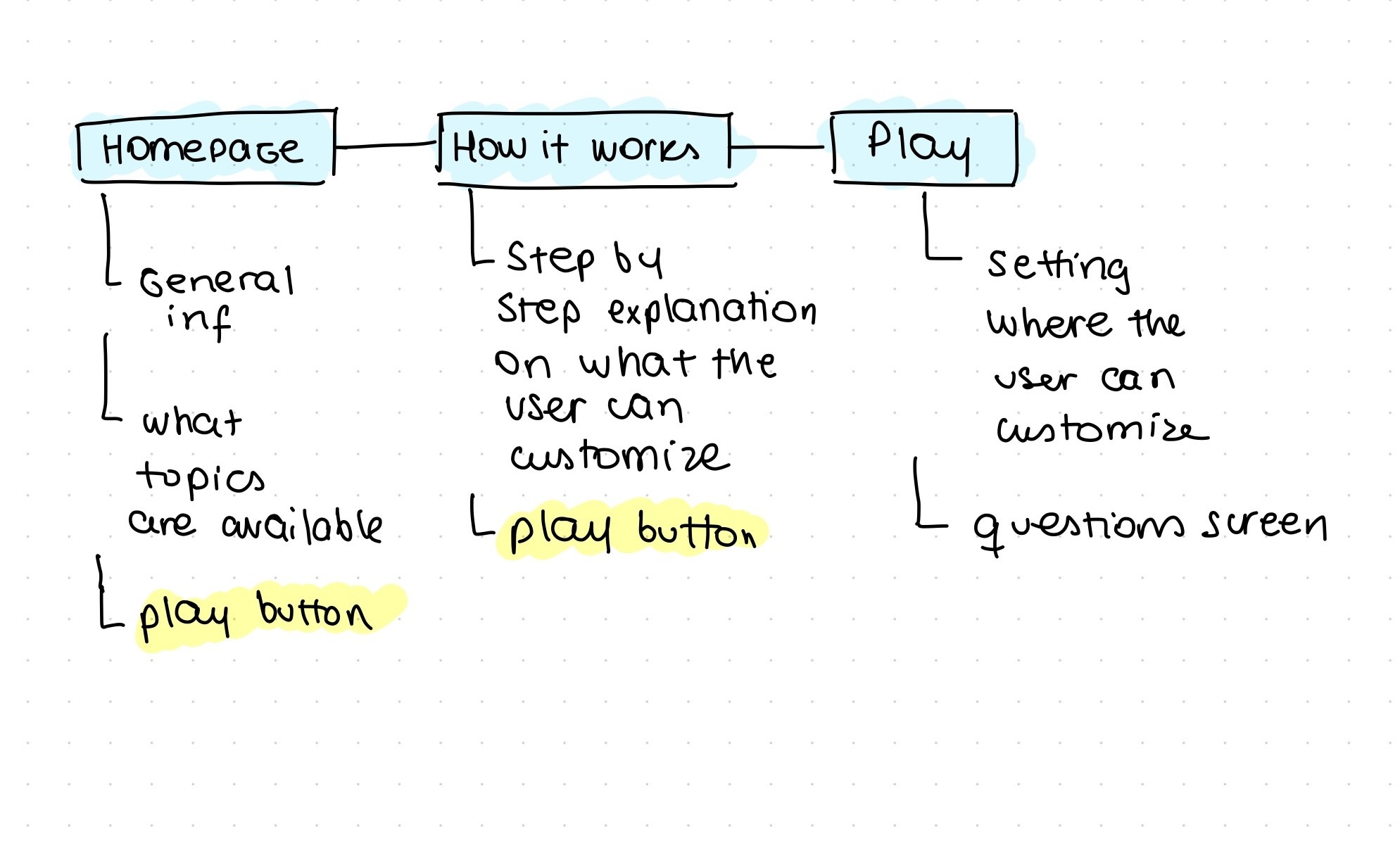 After understanding the class criteria for the project to be accepted, I brainstormed and defined Quizine Trivia’s main features